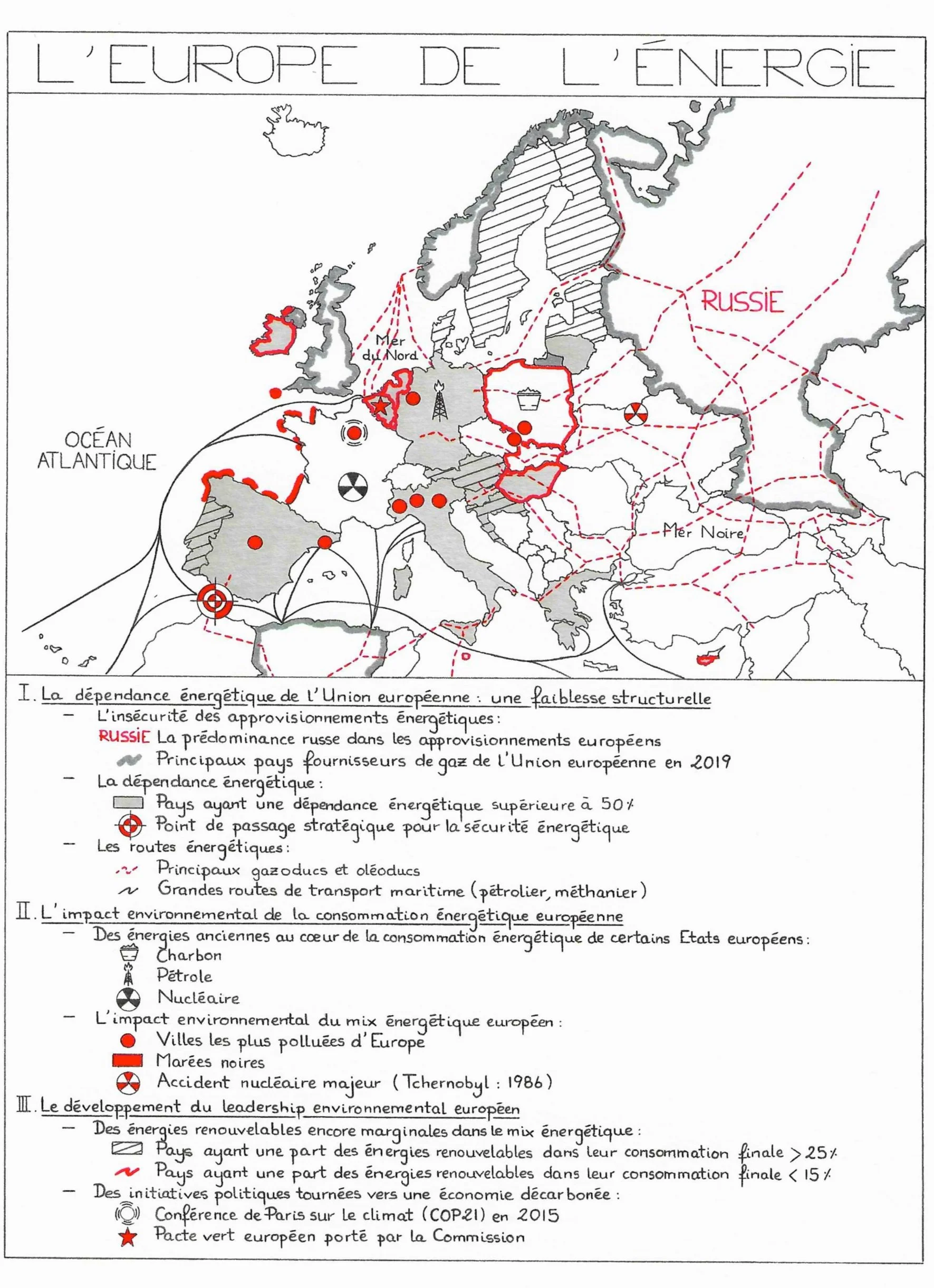 Toutefois, signe de notre dépendance énergétique, la production française fait appel à de nombreuses importations soumises aux aléas géopolitiques. La consommation d’énergie primaire en France repose sur le nucléaire (40%), le pétrole (28%) ou encore le gaz (16%) selon le bilan énergétique de la France (2021). Or, la France a un taux de dépendance énergétique de 48% tant elle est contrainte d’importer son pétrole d’Arabie Saoudite et du Kazakhstan (66% du total) et son gaz majoritairement de Norvège (42%). Depuis les années 1990, l'évolution des sources d’énergies consommées reflète une importante divergence entre croissance vive (énergies renouvelables), hausse modérée (nucléaire, gaz) et baisse rapide (charbon, pétrole). Ces caractéristiques du système énergétique de la France nous assujettissent aux aléas géopolitiques qui affectent les pays producteurs de matières premières.