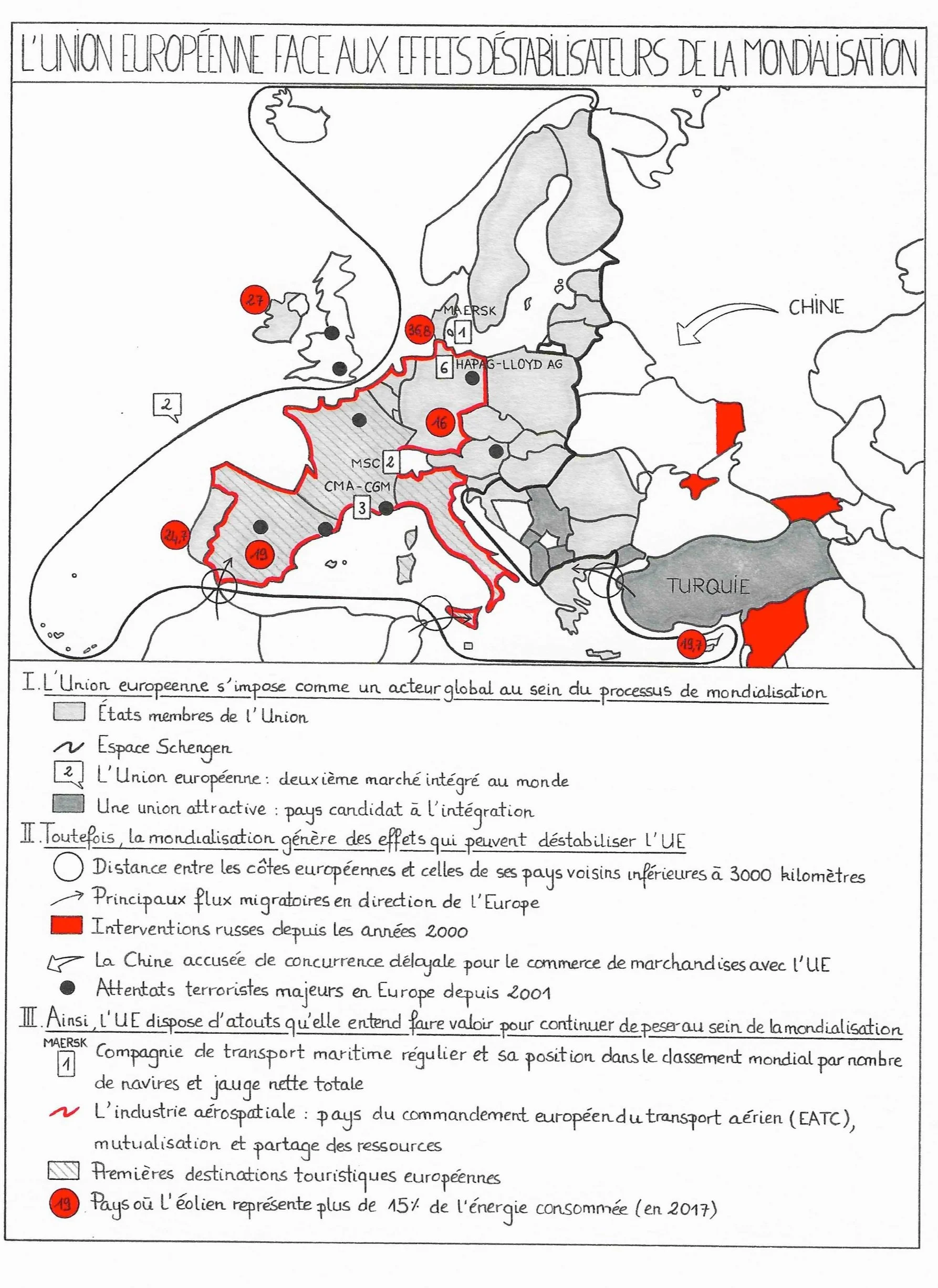 Sur le plan économique, l’Union constitue un bloc compétitif face au retour des protectionnismes. La concurrence internationale et la naissance de blocs quasi-protectionnistes imposent une réaction européenne. D’une part, l’Inflation Reduction Act (IRA) initié par Joe Biden en 2023 accordera près de 400 Md$ de subventions sur 10 ans pour favoriser les industries vertes qui produisent aux États-Unis. D’autre part, la « forteresse Chine » (Nicolas Baverez, Le Figaro, 2022) limite toute pénétration étrangère sur le marché chinois. Face à cela, la stratégie européenne se concrétise par l’entrée en vigueur de législations fortes. Adopté en 2022, le Chips Act vise à renforcer la compétitivité et la résilience européenne dans le domaine des semi-conducteurs en mobilisant 43 Md€ d’investissements publics et privés. Dans son discours à La Haye (avril 2023), Emmanuel Macron a affirmé la nécessité d’une politique économique européenne indépendante au service de l’autonomie stratégique.