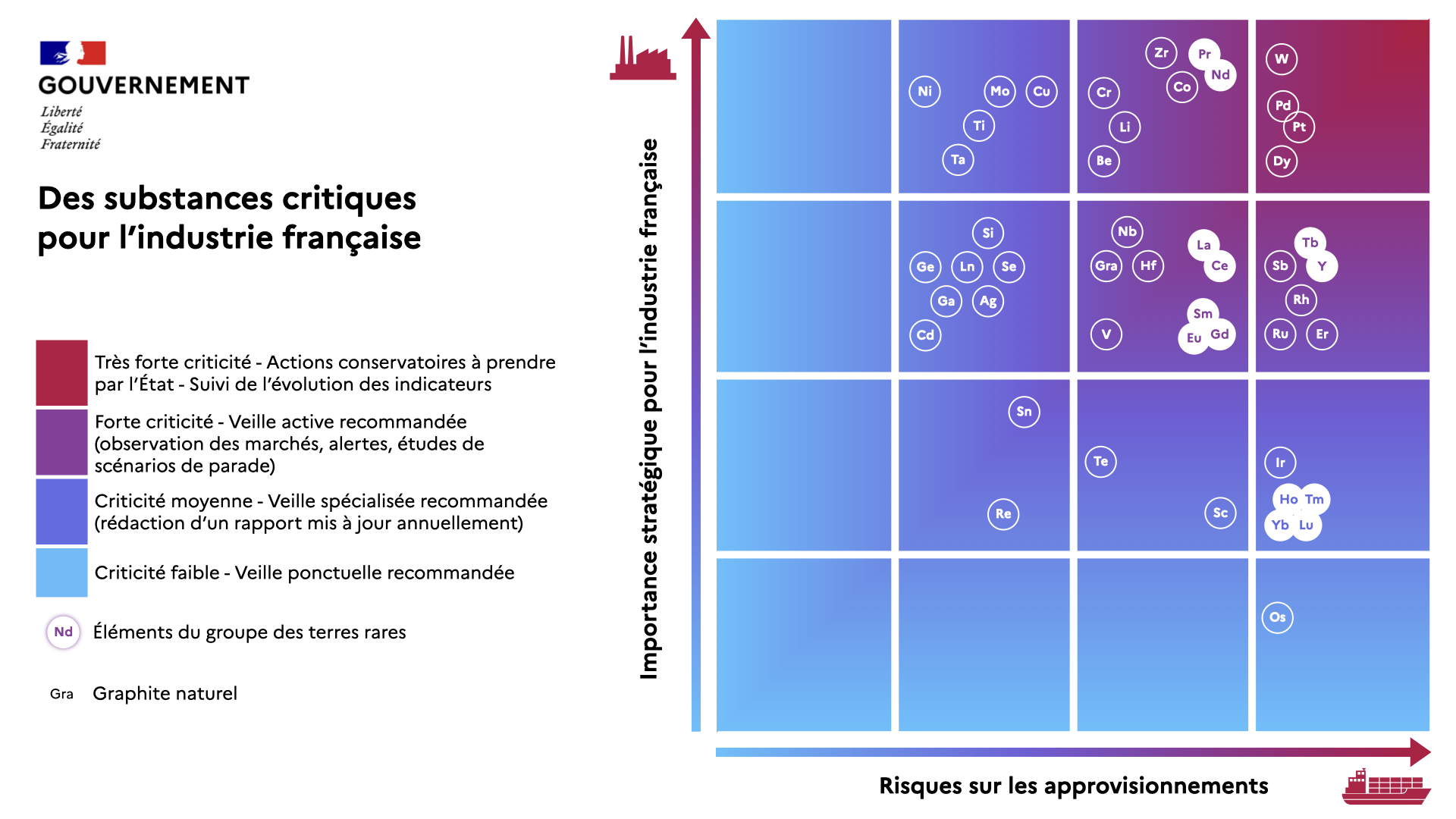 Certains États développent des stratégies spécifiques pour leurs approvisionnements critiques. En France, le ministère de la Transition Écologique et le ministère de l’Industrie ont créé en 2015 le comité aux métaux stratégiques (Comes) visant 3 objectifs : sensibiliser les filières industrielles sur les risques d’approvisionnement en matières premières ; valoriser les ressources primaires (extraites) et secondaires (recyclées) du territoire ; engager une diplomatie des matières premières. Par suite du rapport émis par Philippe Varin, ancien PDG du groupe PSA, la France fonde en 2022 l’Observatoire français des ressources minérales (OFREMI) afin de sécuriser son accès aux métaux critiques. Parmi les pays émergents, les programmes « Make in India » ou « Made in China 2025 », qui prolongent des stratégies anciennes d’extraction et de production de masse, mettent l’accent sur la maîtrise de ces ressources uniques. La multiplication des stratégies matériaux critiques renforcent la concurrence internationale.